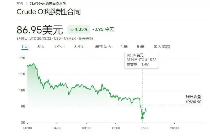 以美国纽约商品交易所4月交货的轻质原油期货价格为例,在特朗普的这一言论公布之前,该价格在约94美元/桶波动,特朗普这一言论公布后,该价格一度跌至82.9美元/桶。